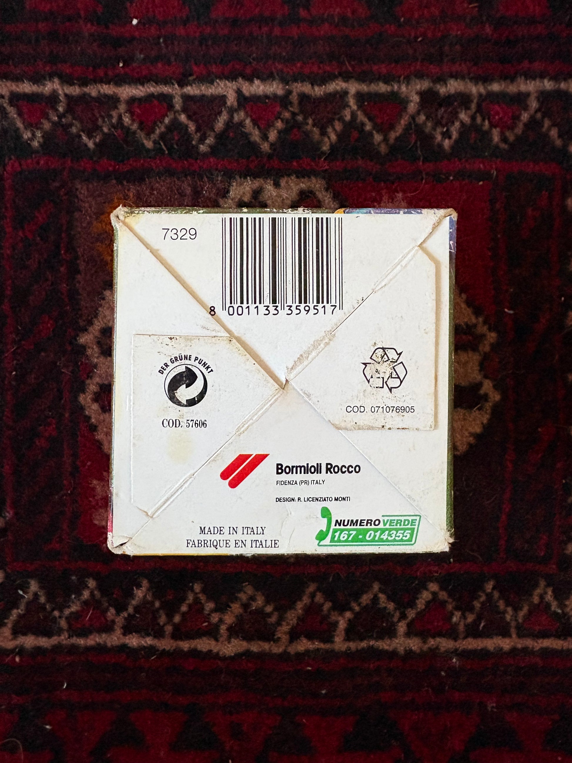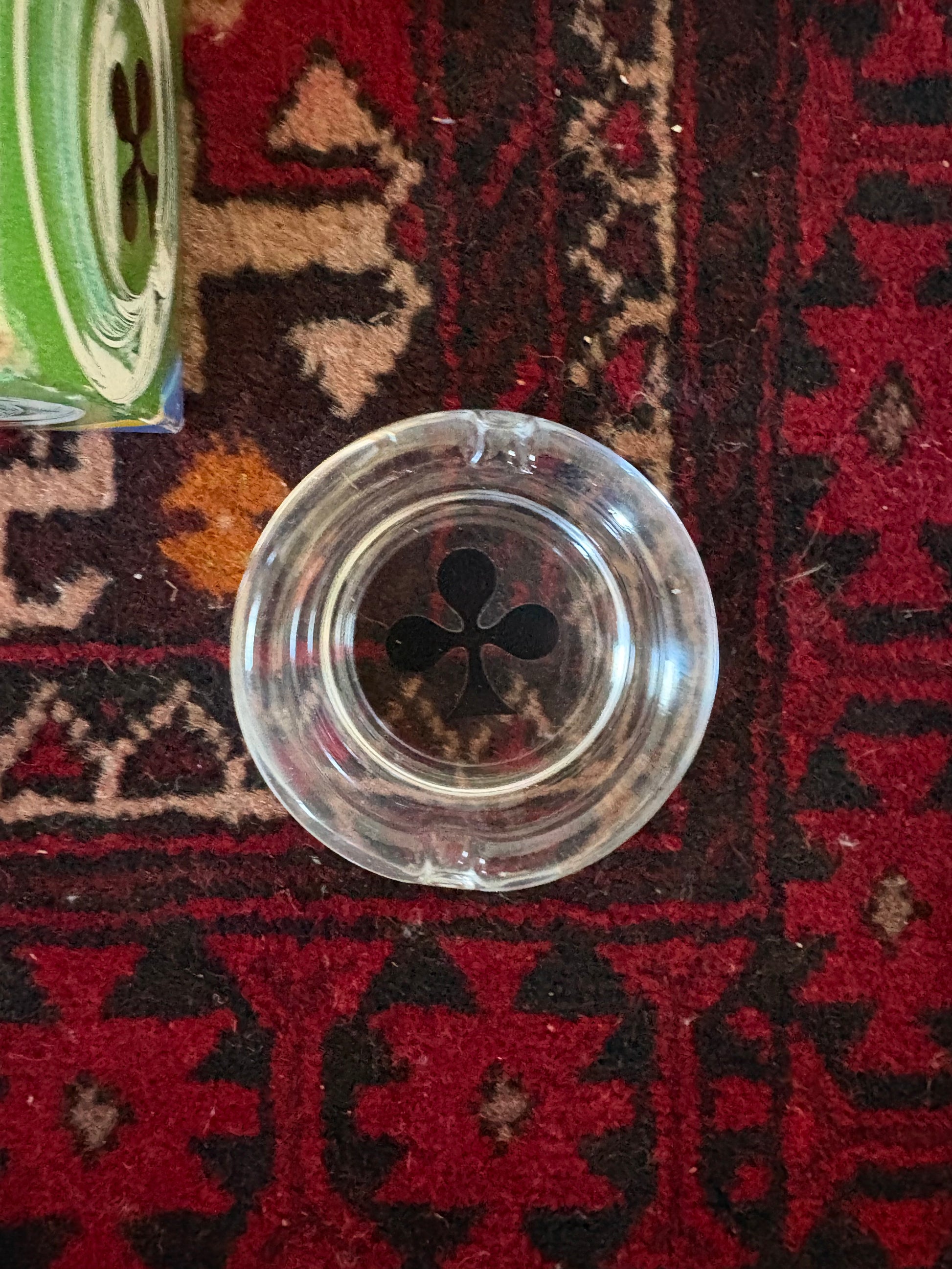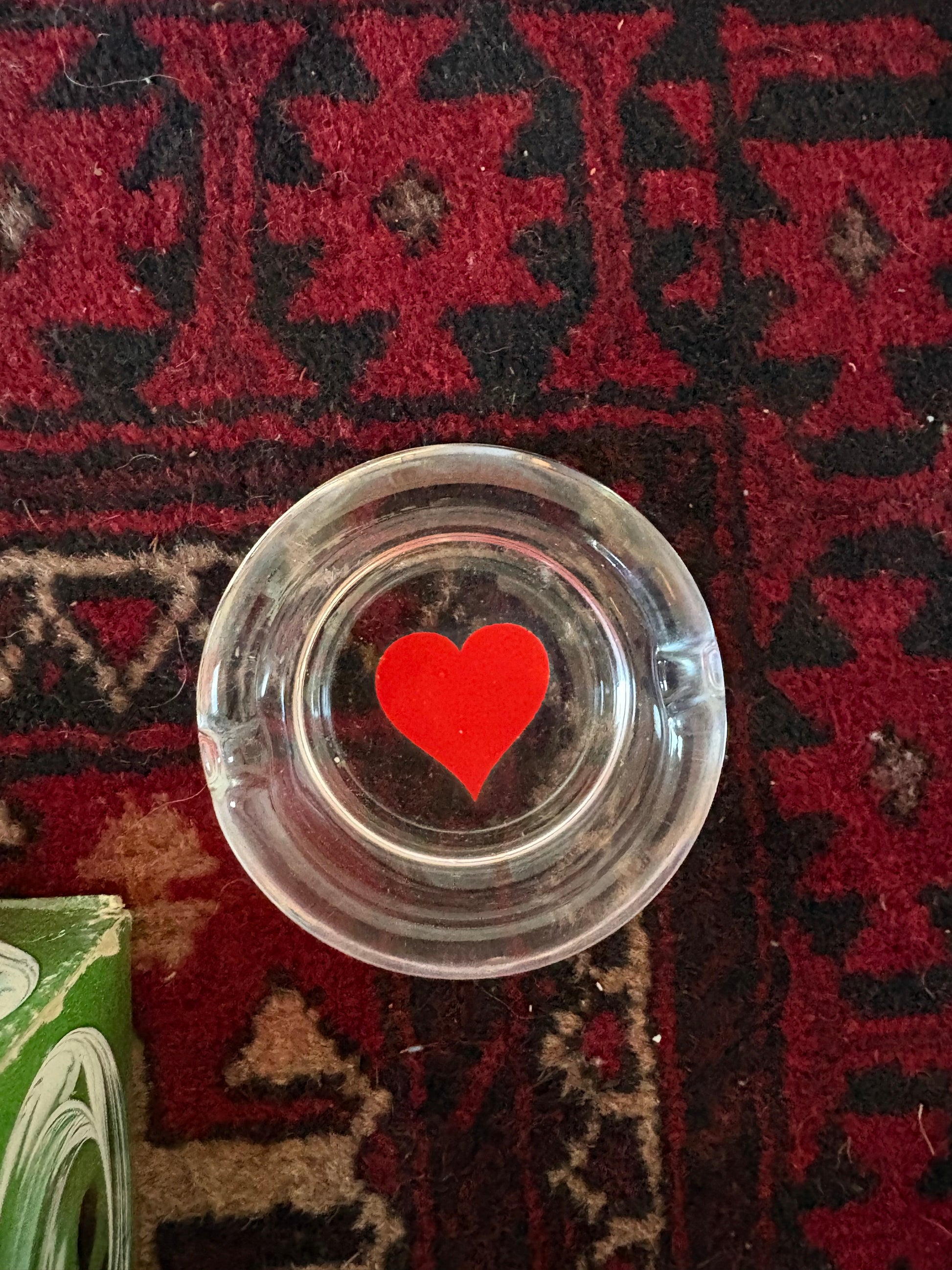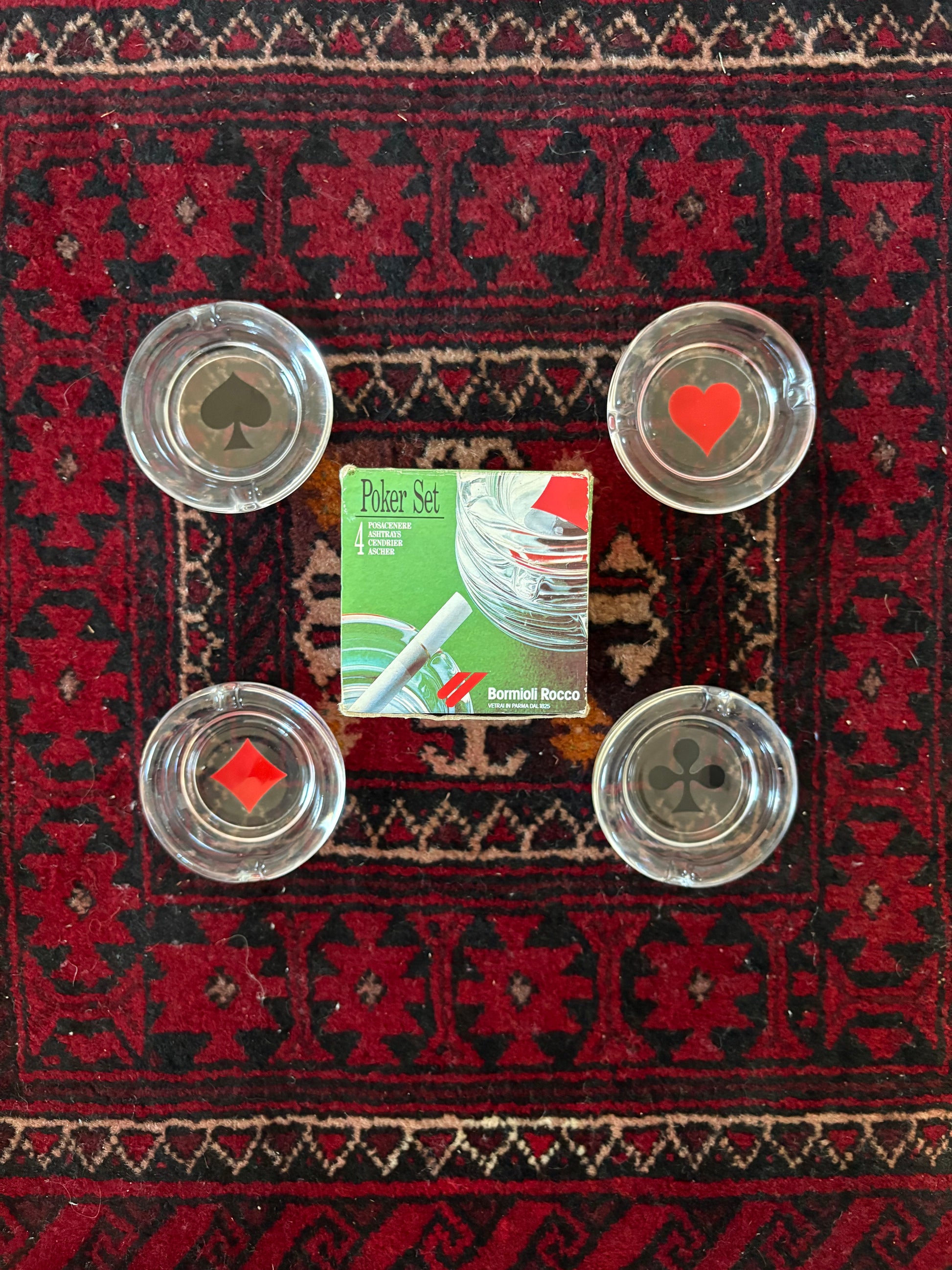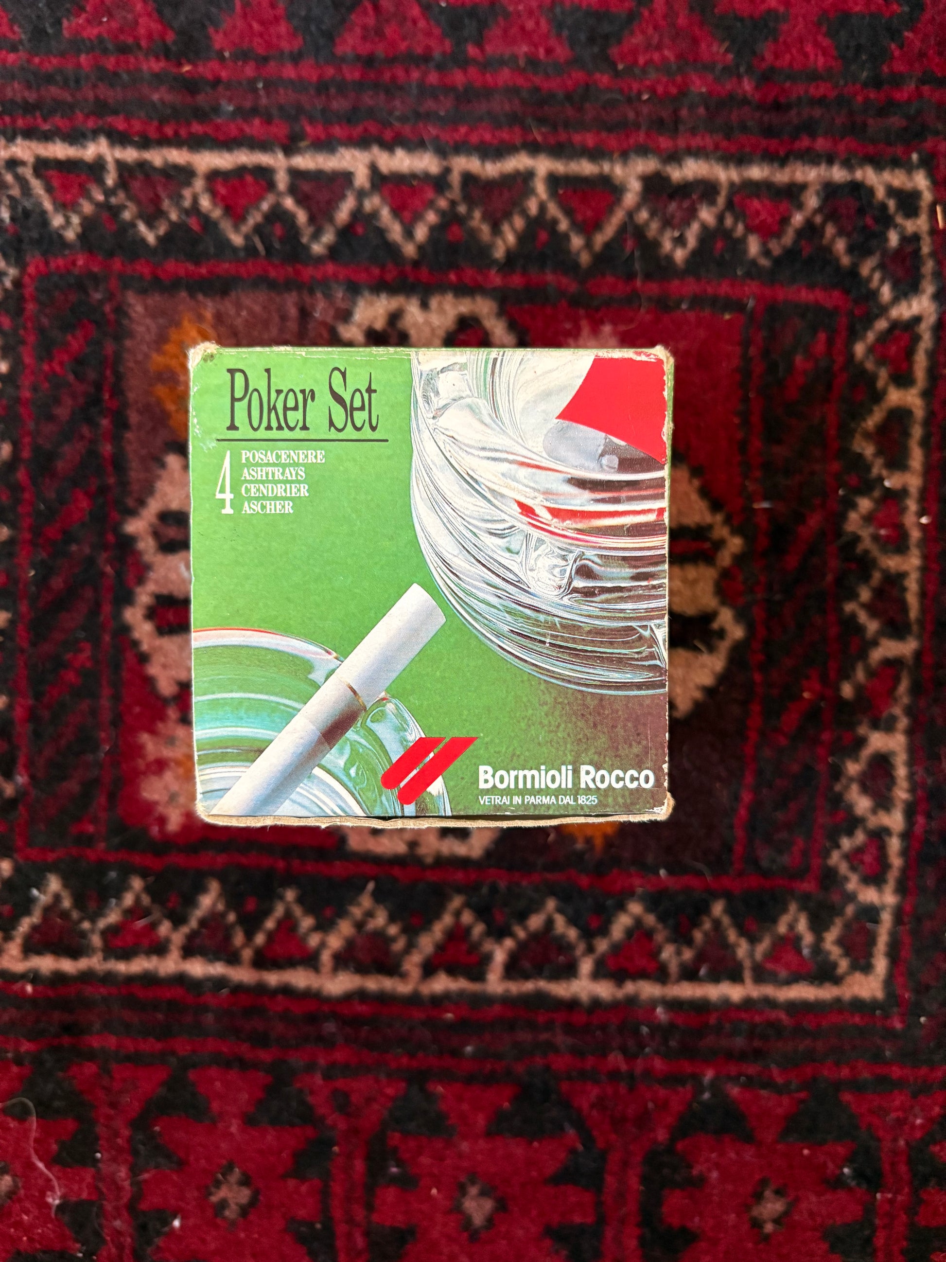 A set of four Italian made ashtrays by Bormioli Rocco. Each ashtray has a different card suit symbol at its base. Dead stock with original packaging.