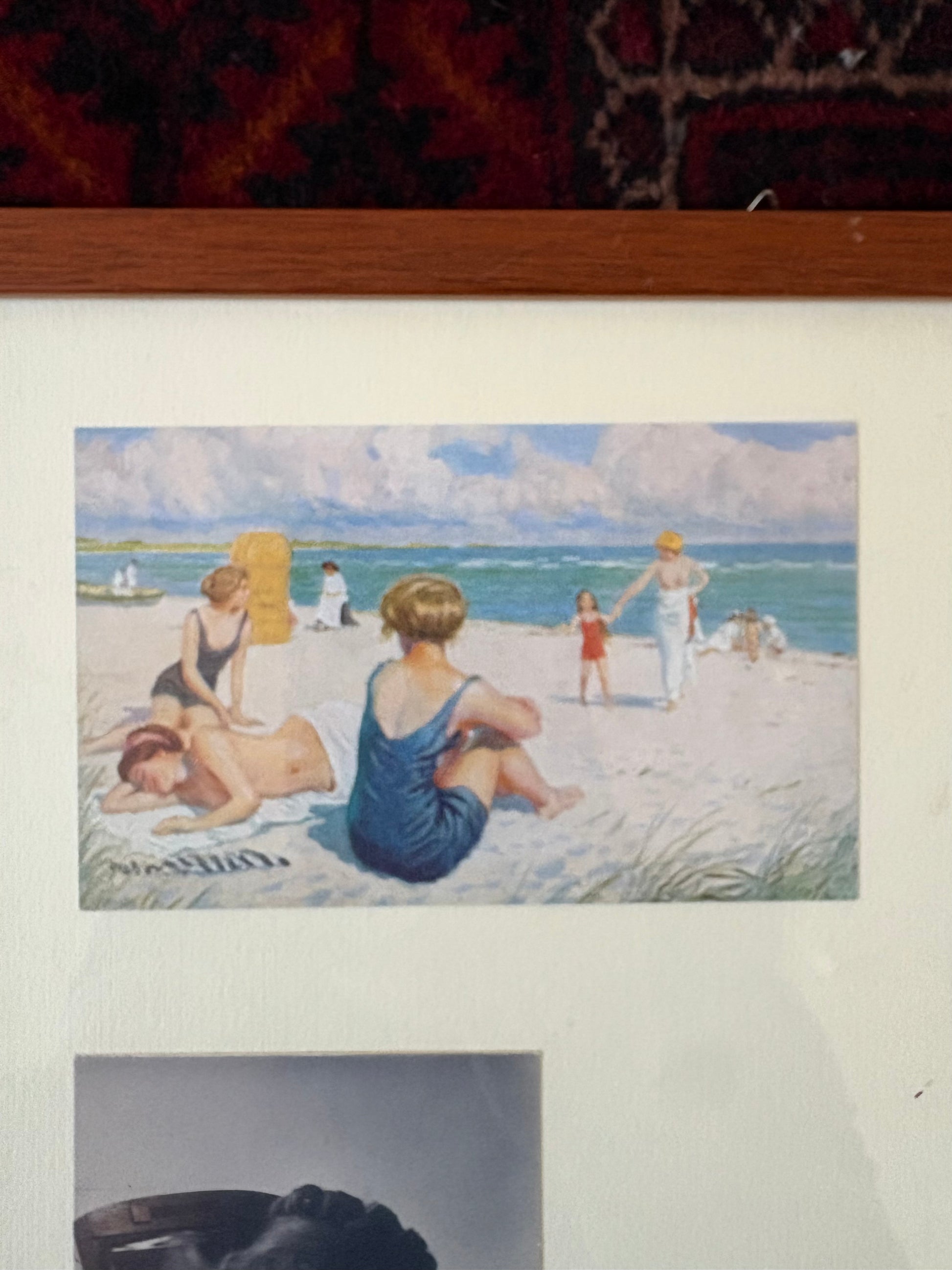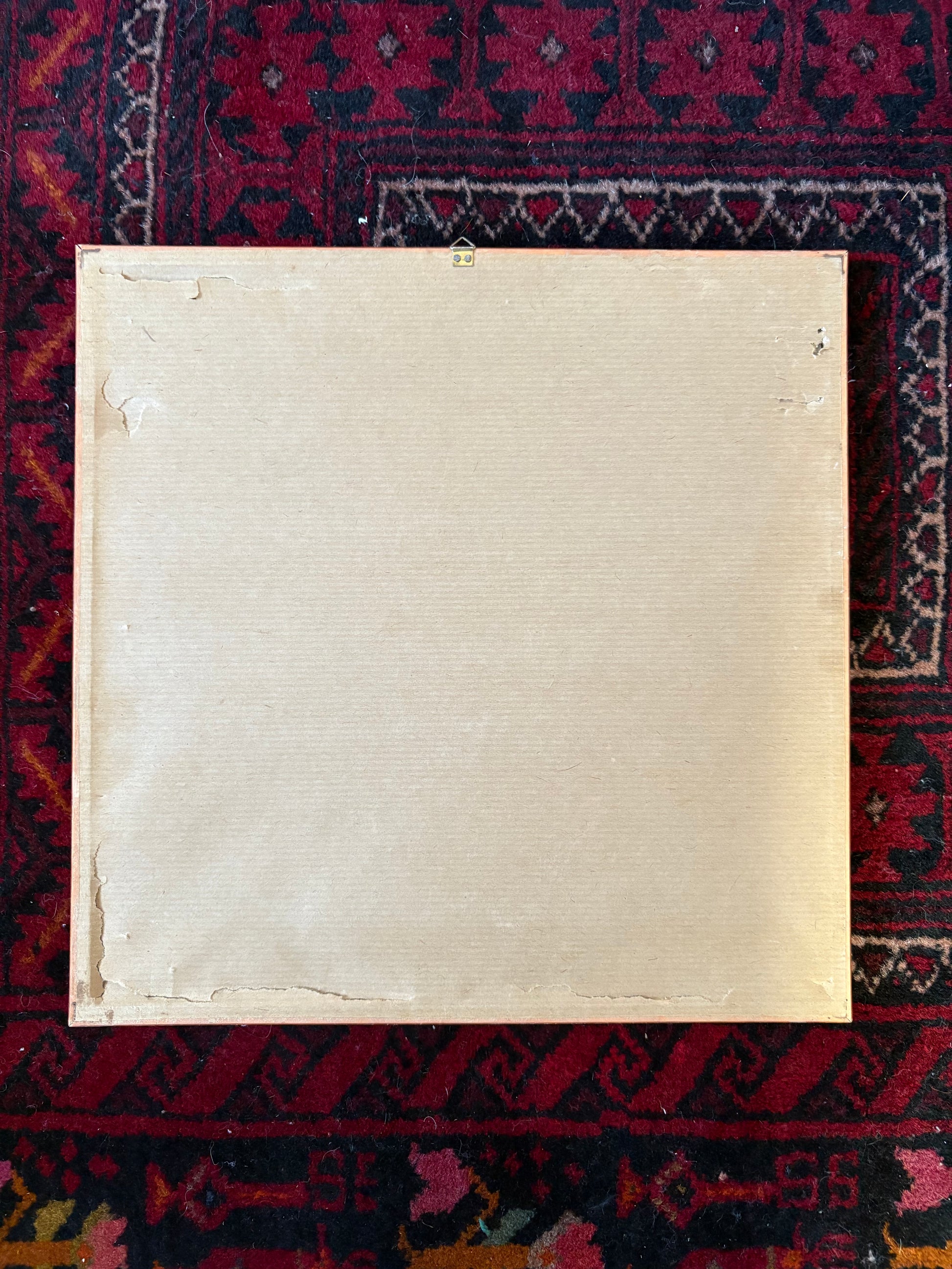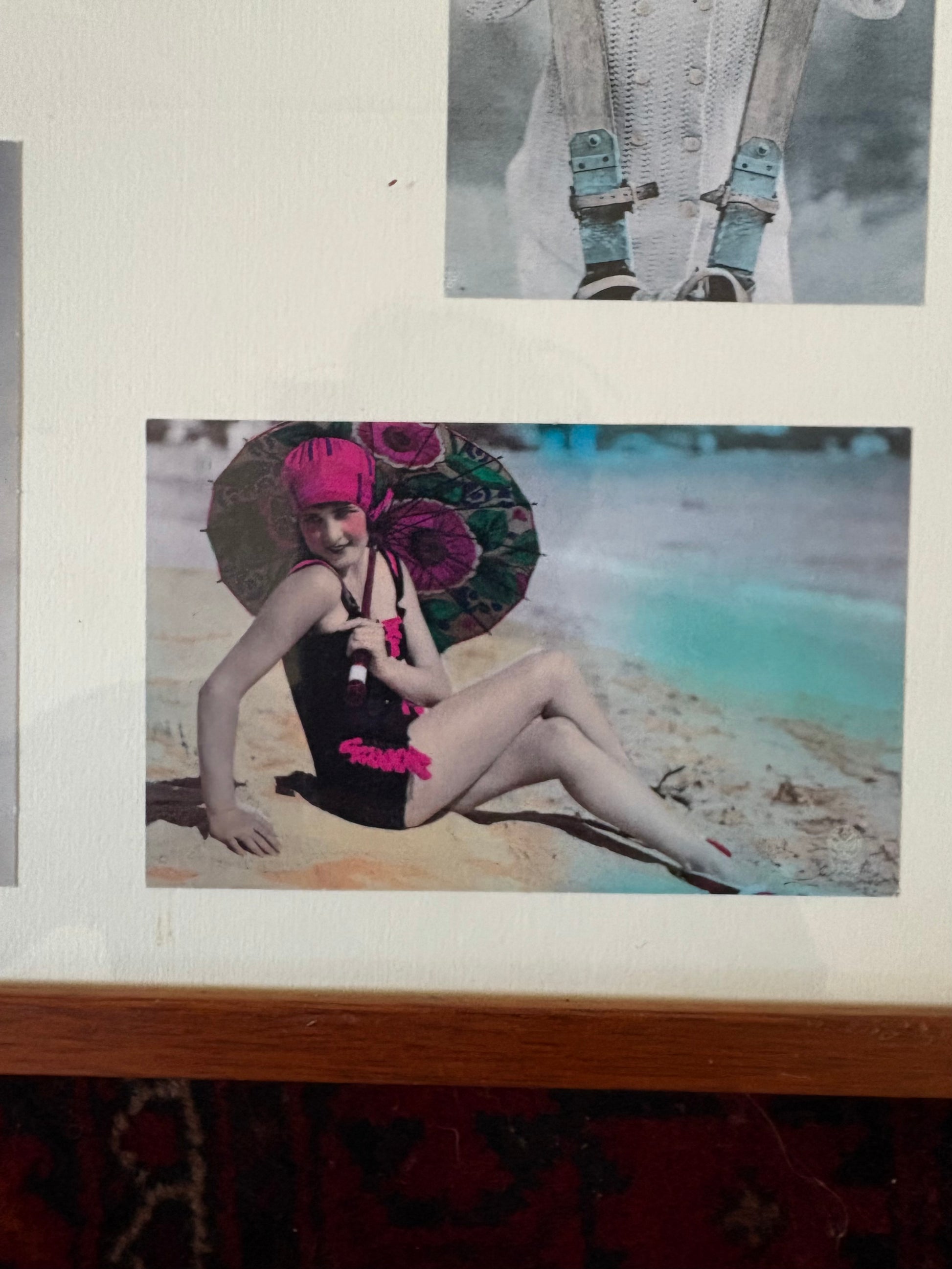 Four Victorian colored photographs set on a white mat in a simple wooden frame. Hangs by d-ring. Sourced in Florence, Italy.