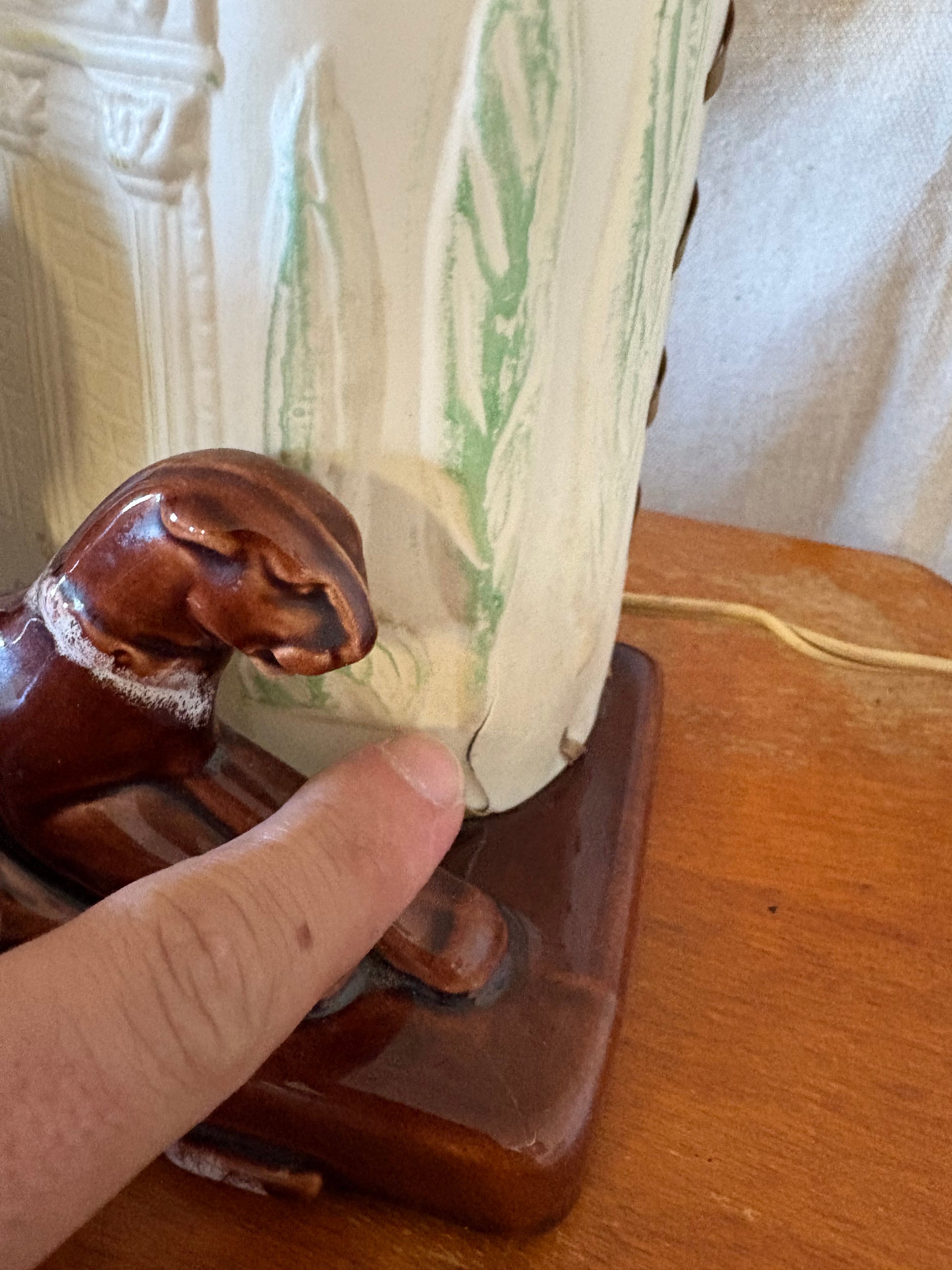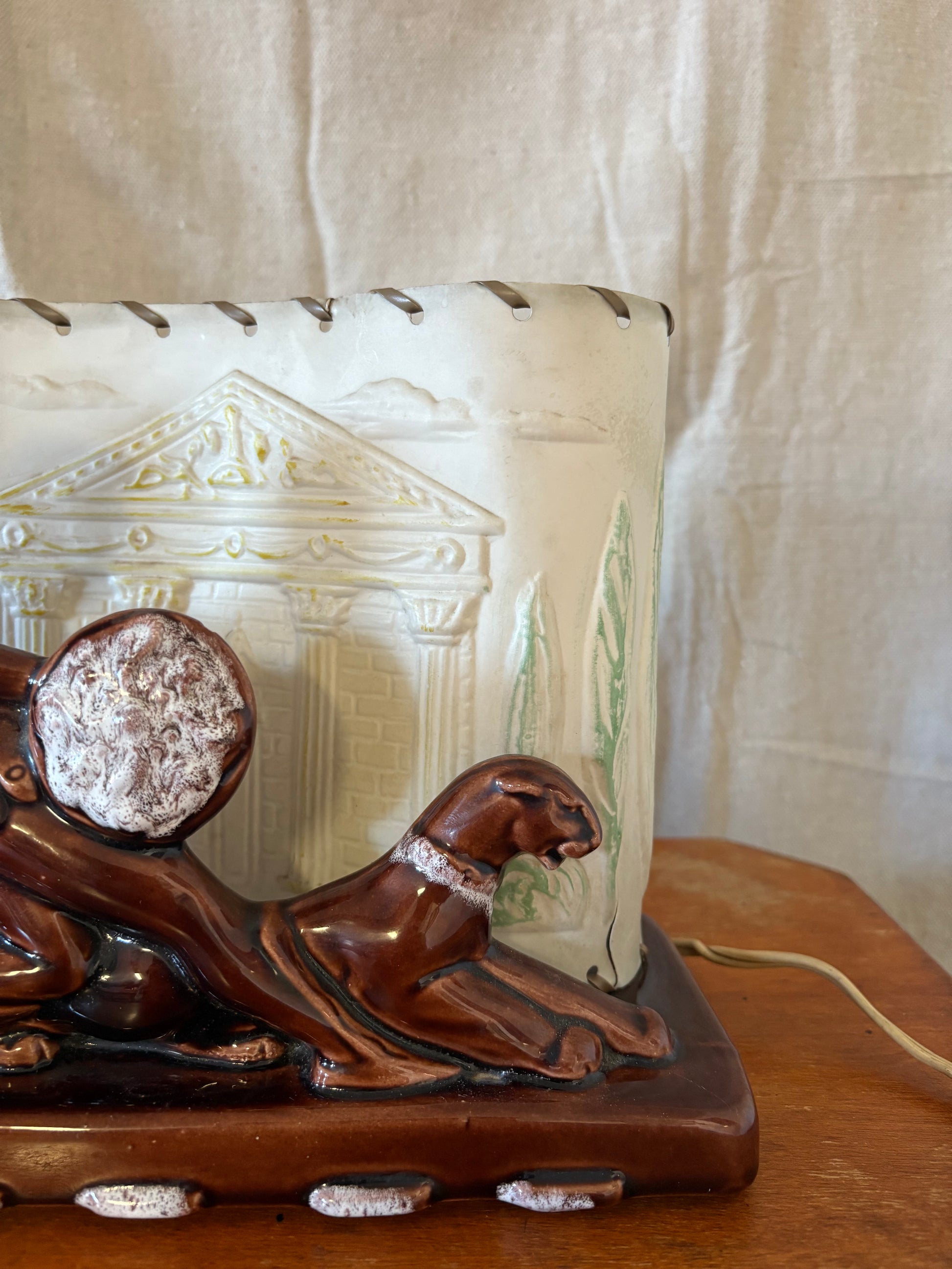 A rare midcentury ceramic TV lamp. A column, gladiator, and panther sit in front of a contoured plastic shade with a lightly painted relief of a Roman building and cypress trees. Original hardware. One tiny crack to shade—see pics.