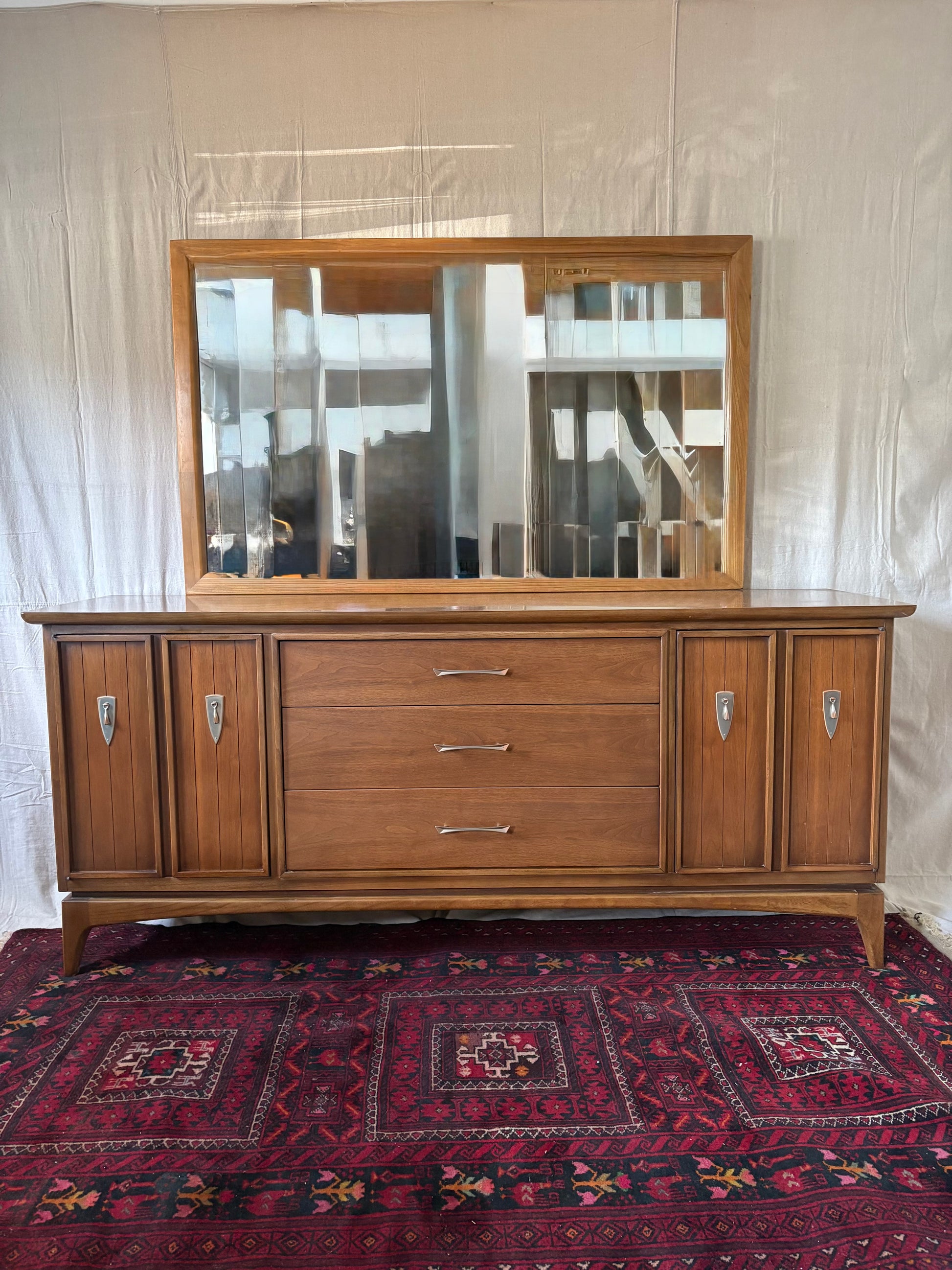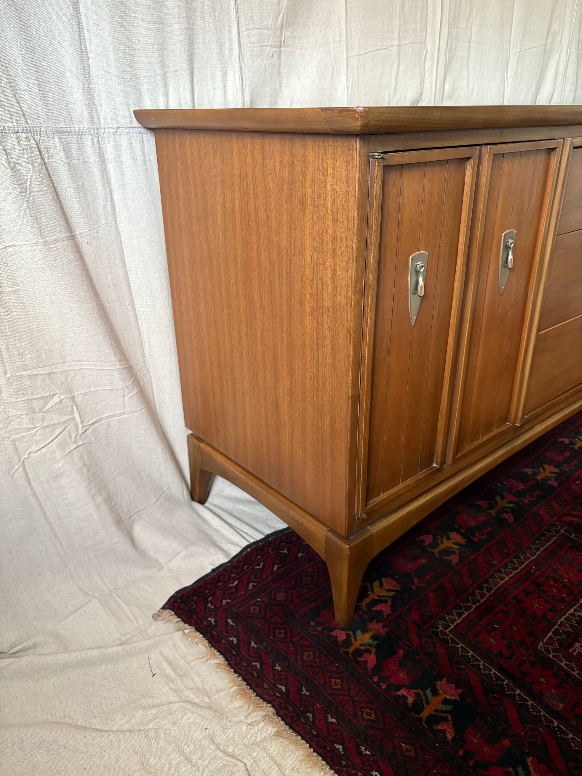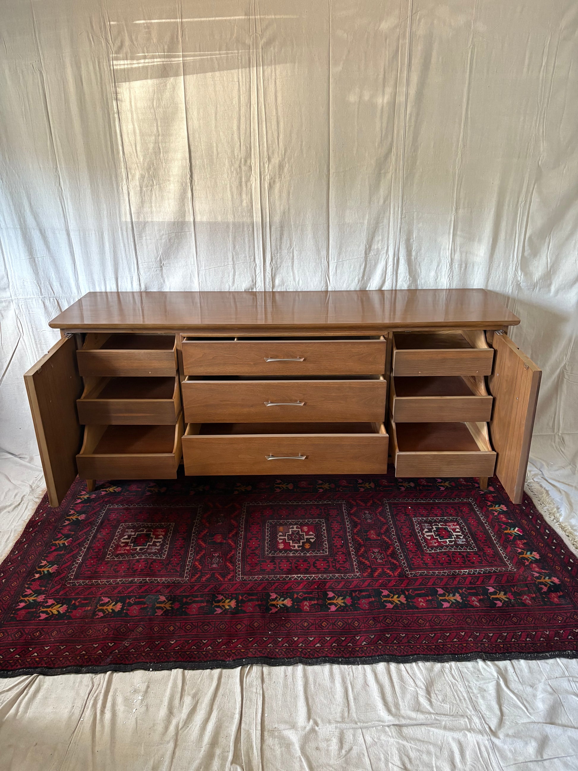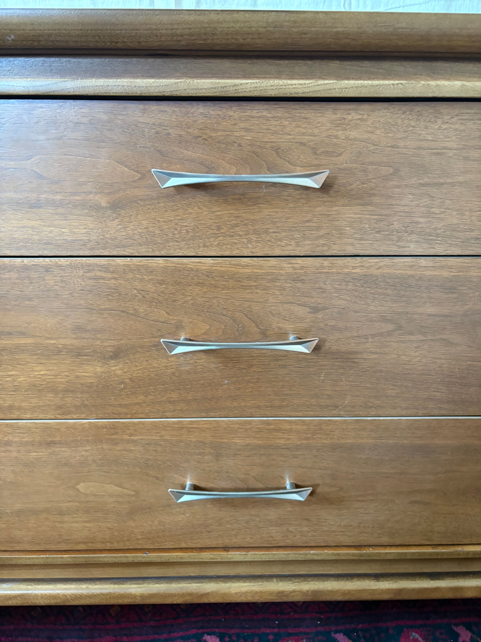A fantastic nine-drawer walnut low dresser by Kent Coffey for the Wharton collection from 1959. This piece features three large central drawers which open via beautifully contoured long nickel pulls. These drawers are flanked by a cabinet door on each side each of which conceal three smaller drawers. These doors have beautiful details including thin vertical pinstripes and small dangling nickel pulls with shield-shaped backings. This dresser sits atop slender spider legs built into an integral stretcher base. The original large walnut framed mirror is included and can be affixed to the back or hung by d-rings. This piece is in fantastic condition for its age with no notable wear.