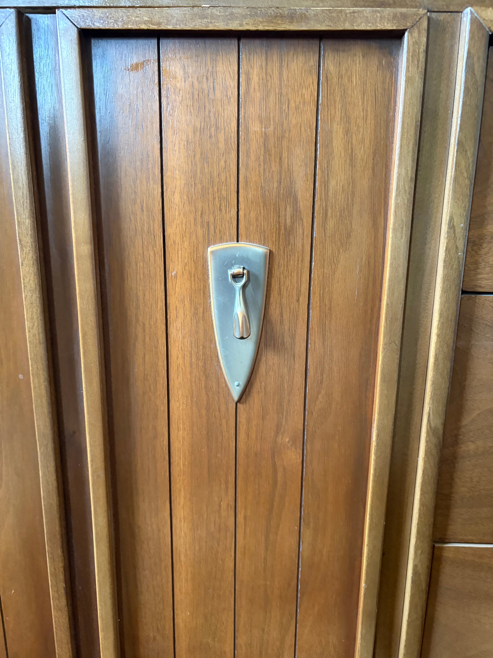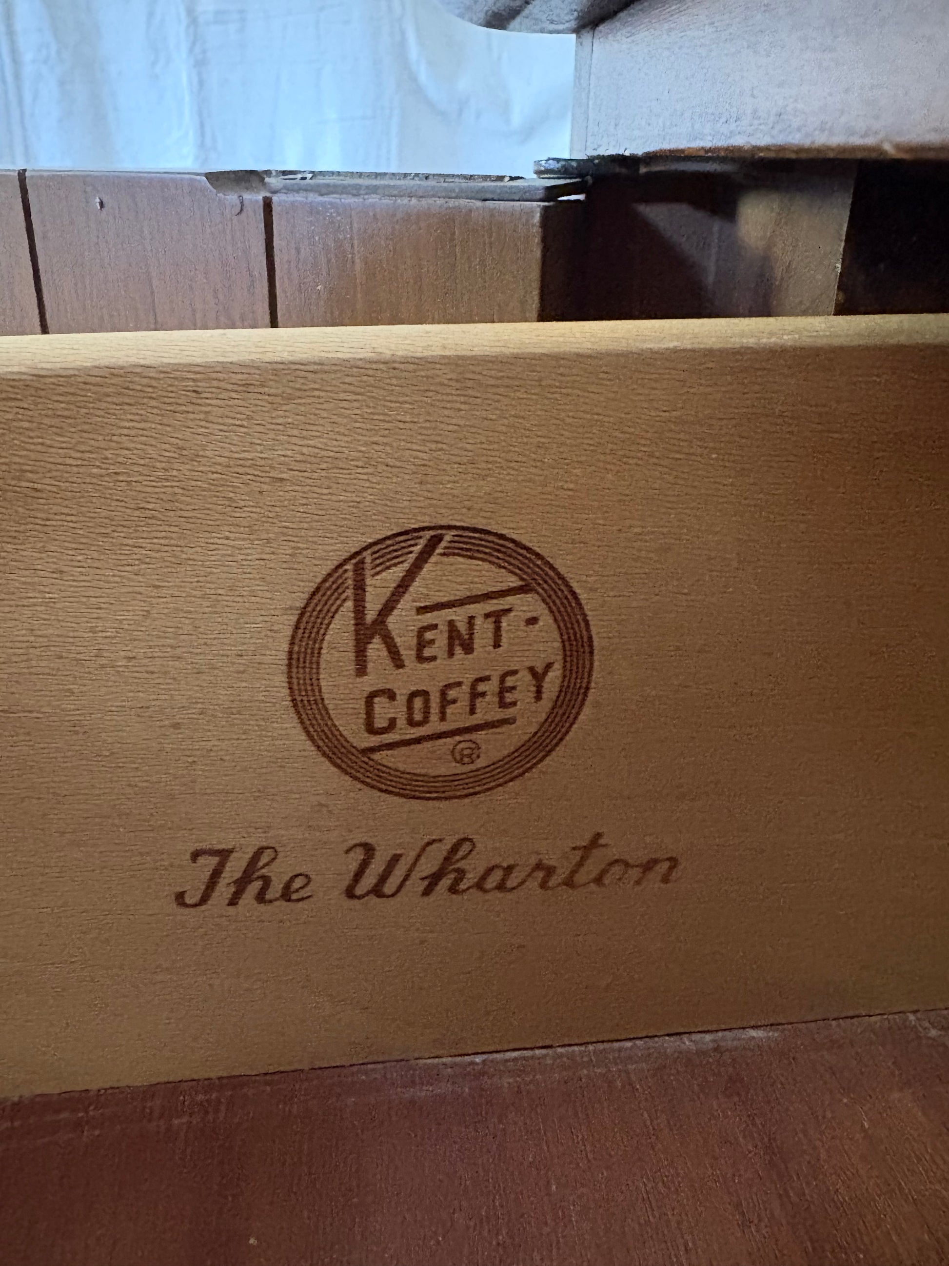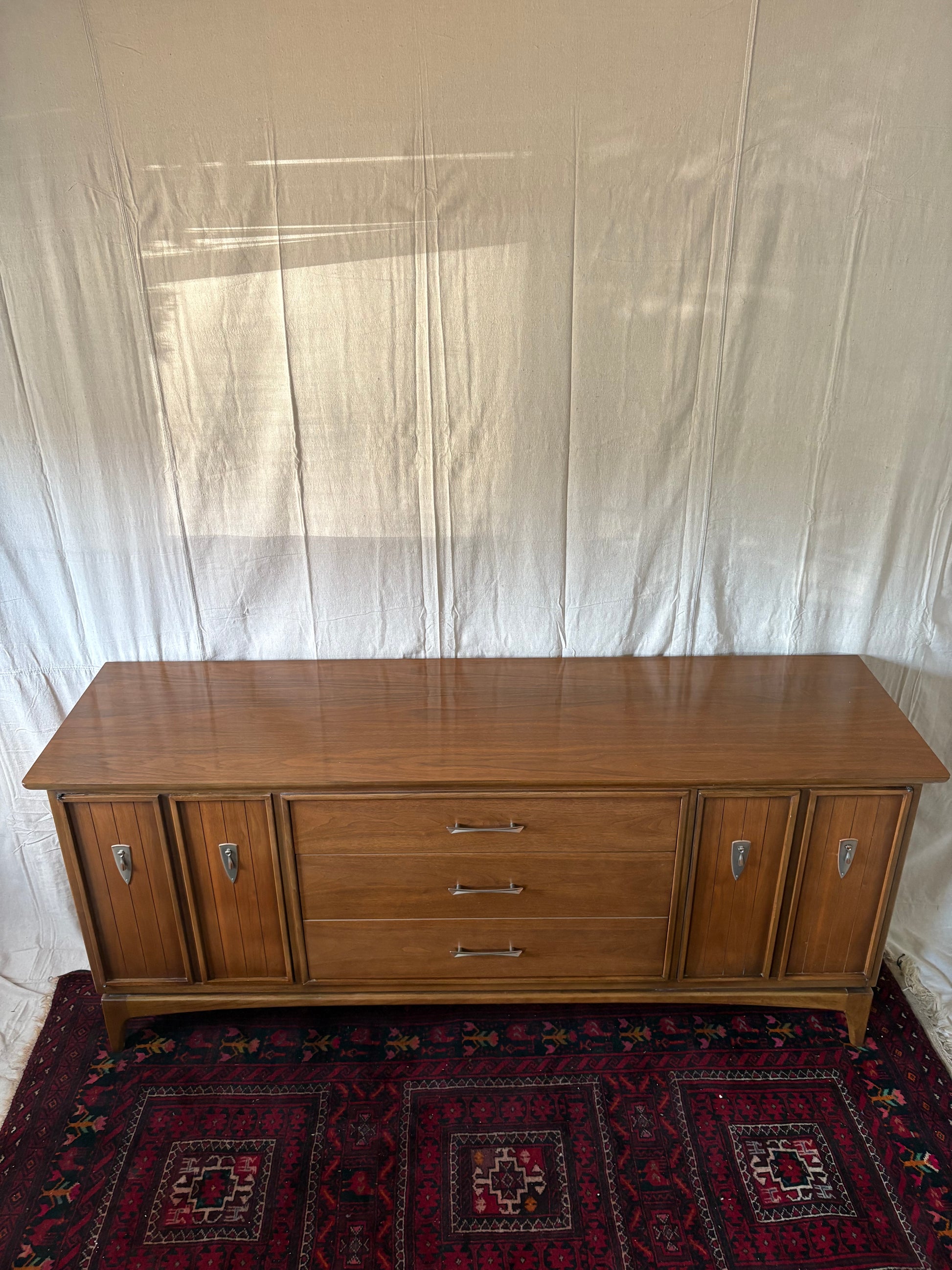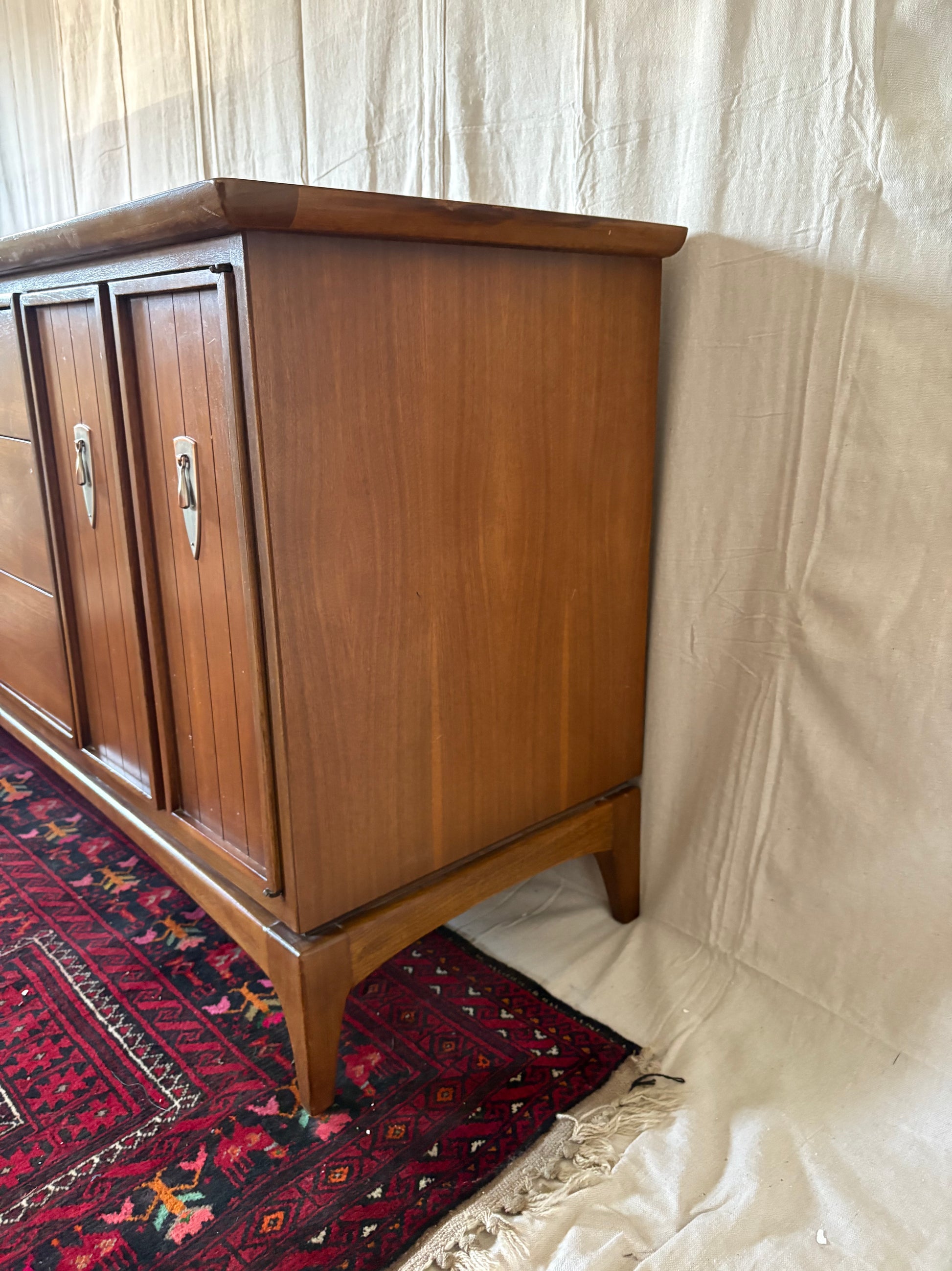 A fantastic nine-drawer walnut low dresser by Kent Coffey for the Wharton collection from 1959. This piece features three large central drawers which open via beautifully contoured long nickel pulls. These drawers are flanked by a cabinet door on each side each of which conceal three smaller drawers. These doors have beautiful details including thin vertical pinstripes and small dangling nickel pulls with shield-shaped backings. This dresser sits atop slender spider legs built into an integral stretcher base. The original large walnut framed mirror is included and can be affixed to the back or hung by d-rings. This piece is in fantastic condition for its age with no notable wear.
