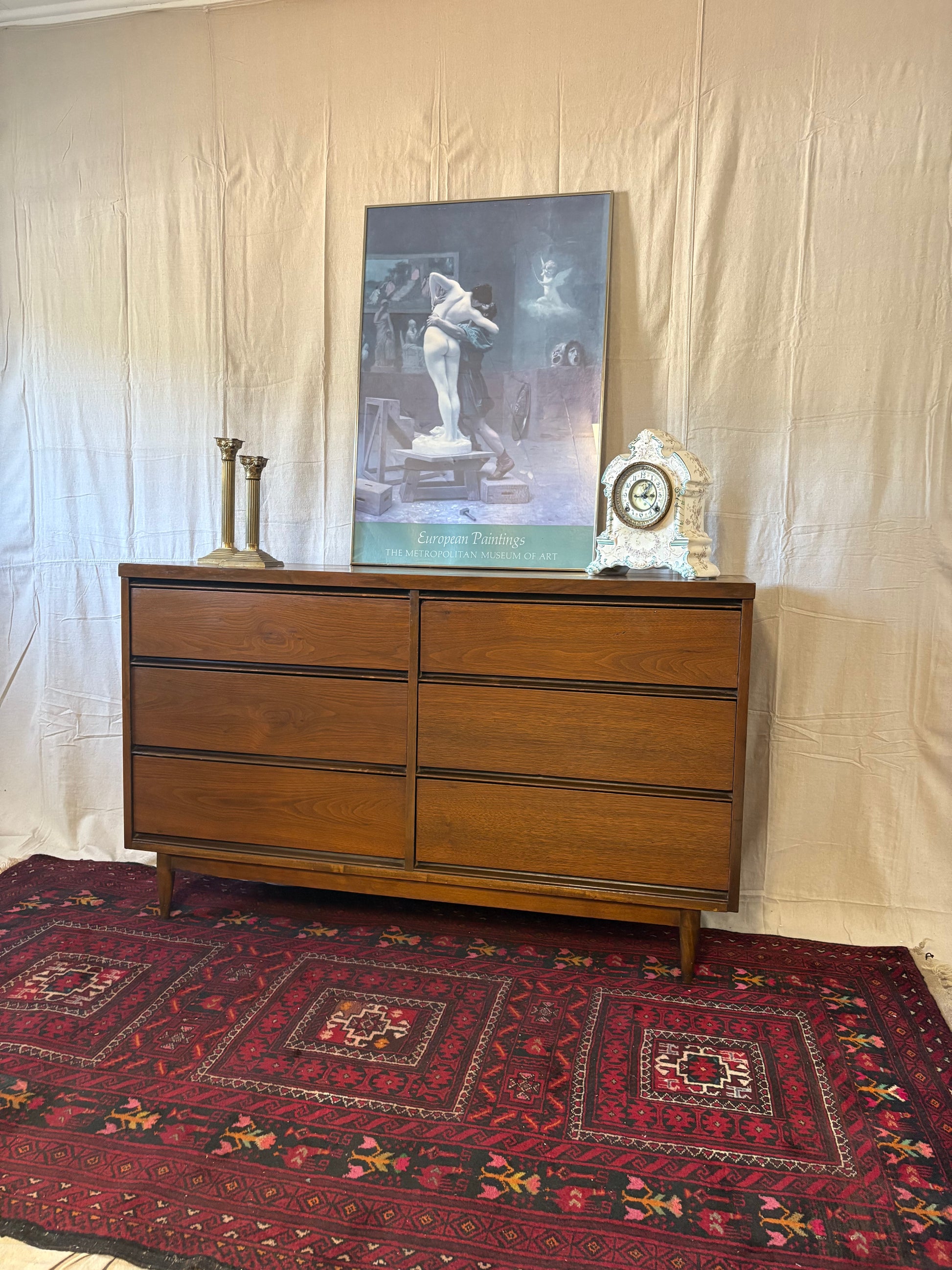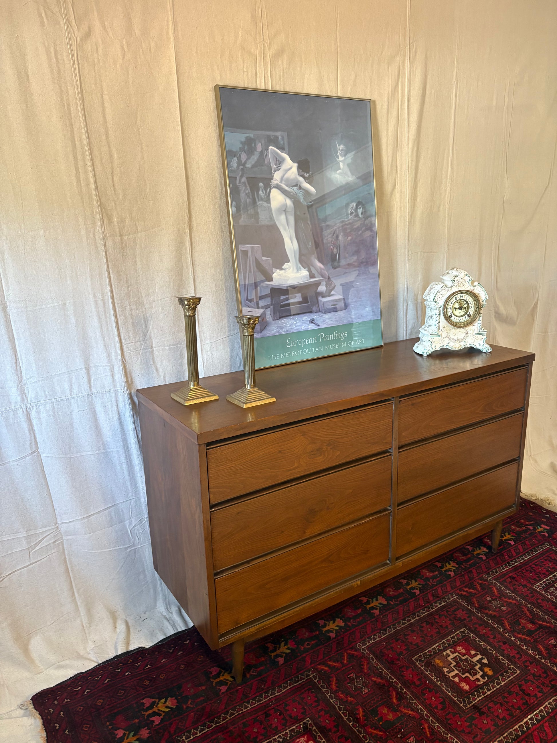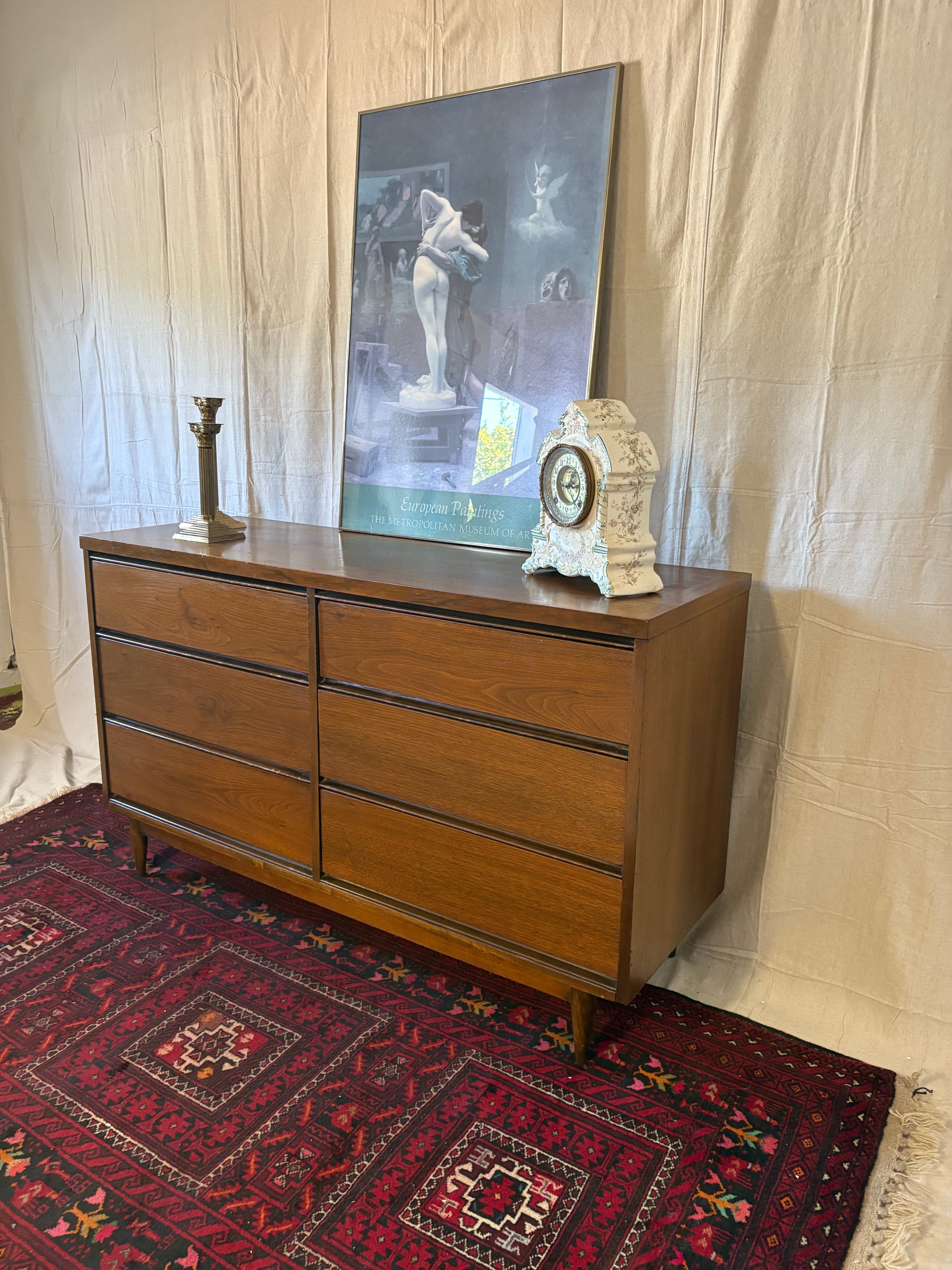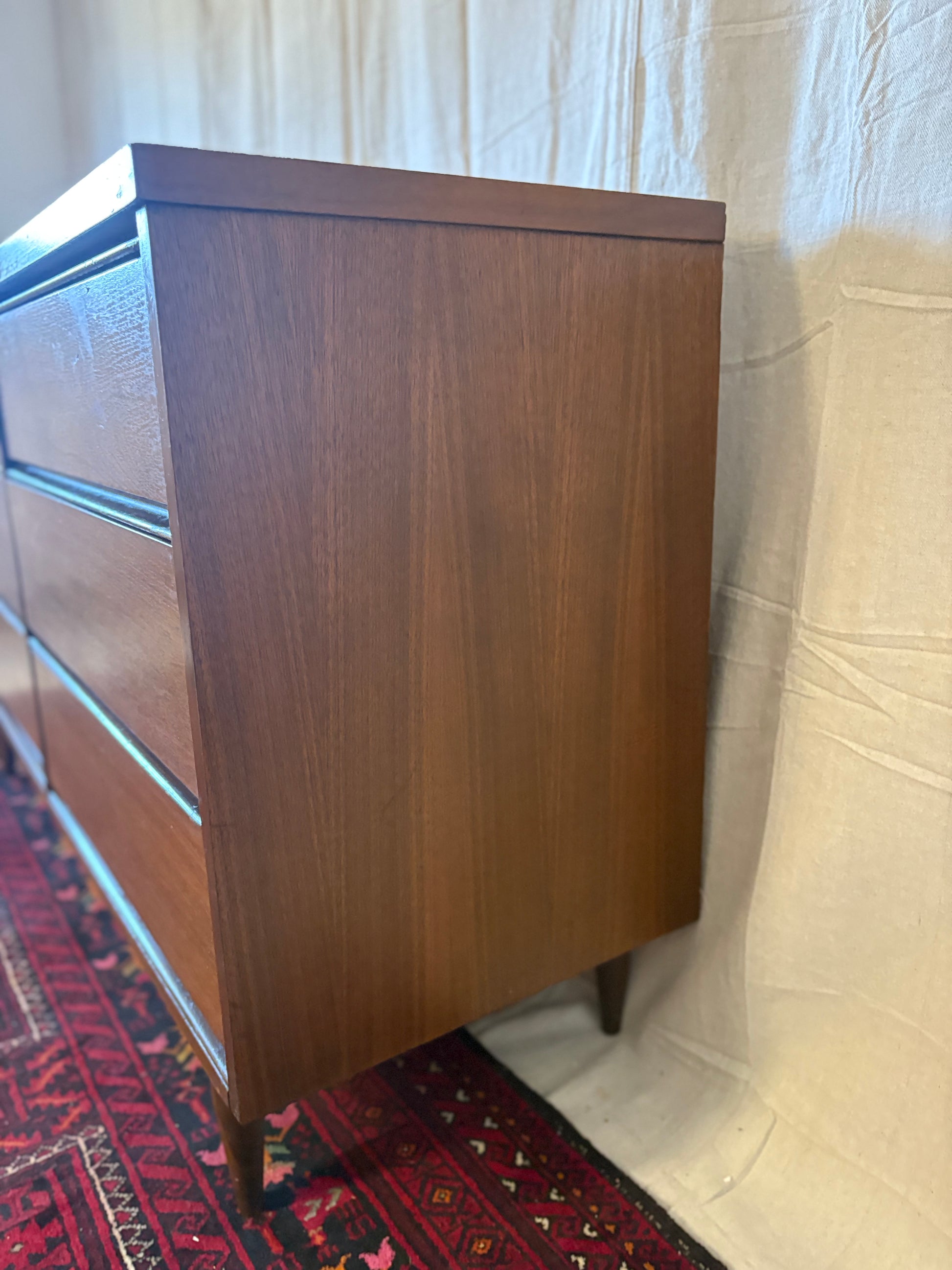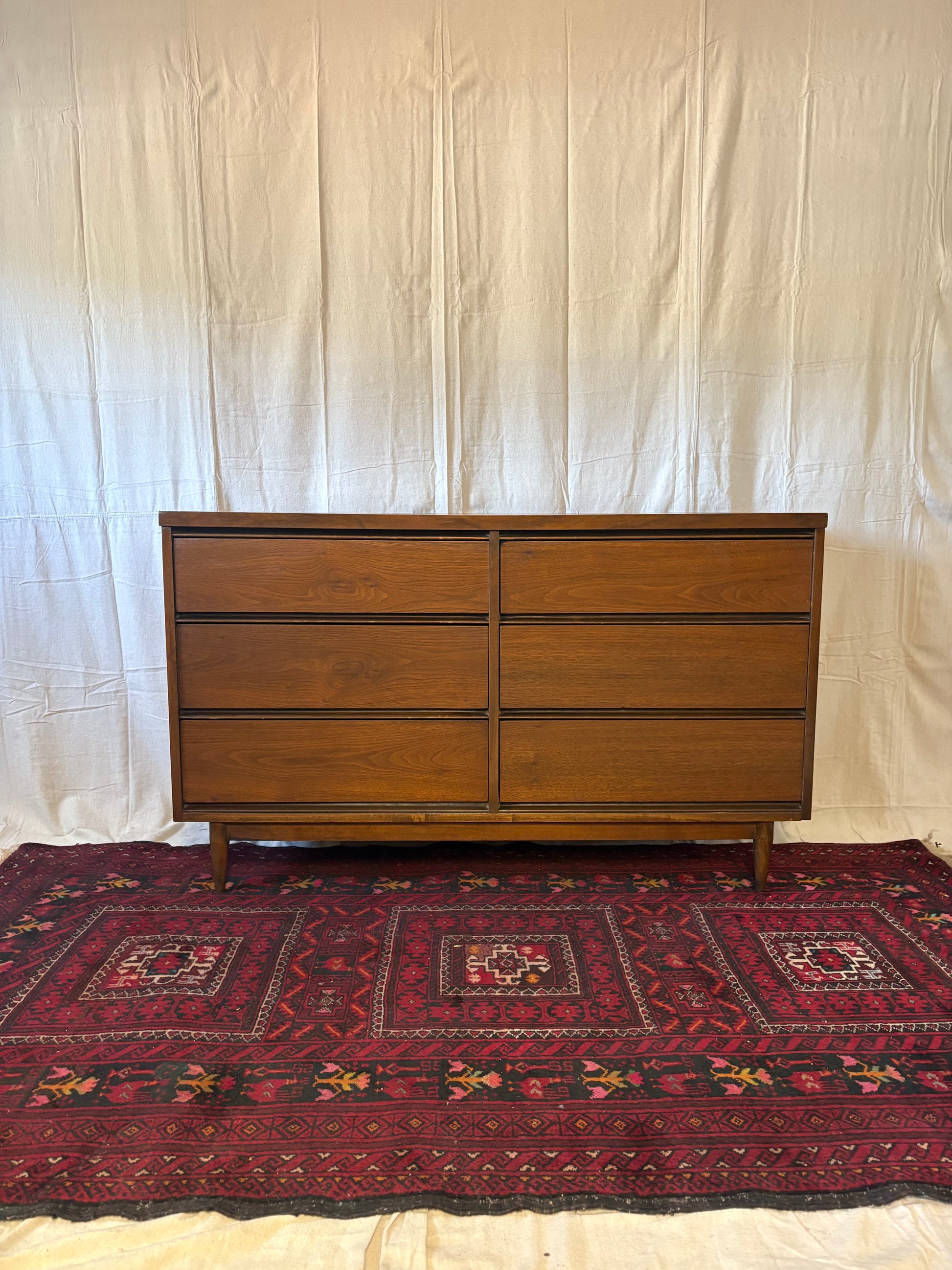 A classic midcentury walnut six-drawer double dresser. The two stacks of three drawers feature hidden sculpted pulls set into the underside of each drawer face. This piece sits atop tapered turned legs connected by a stretcher base. There are some spots of wear including some fading to top and small veneer chips—see pics for all blemishes.