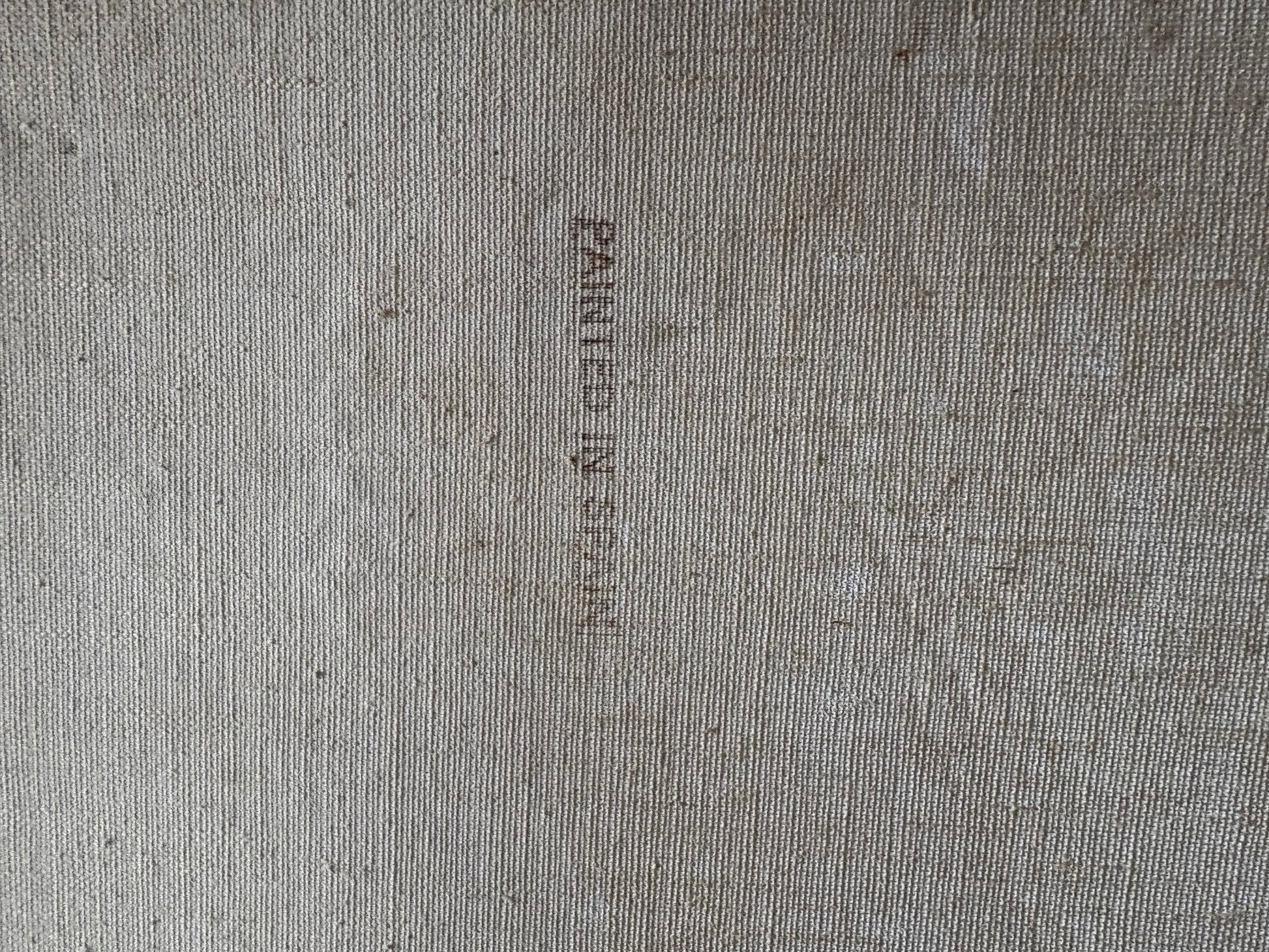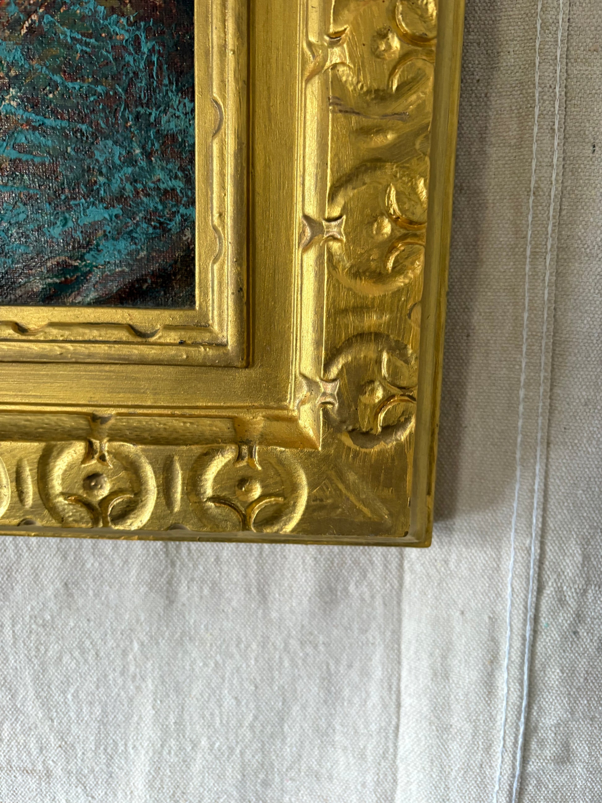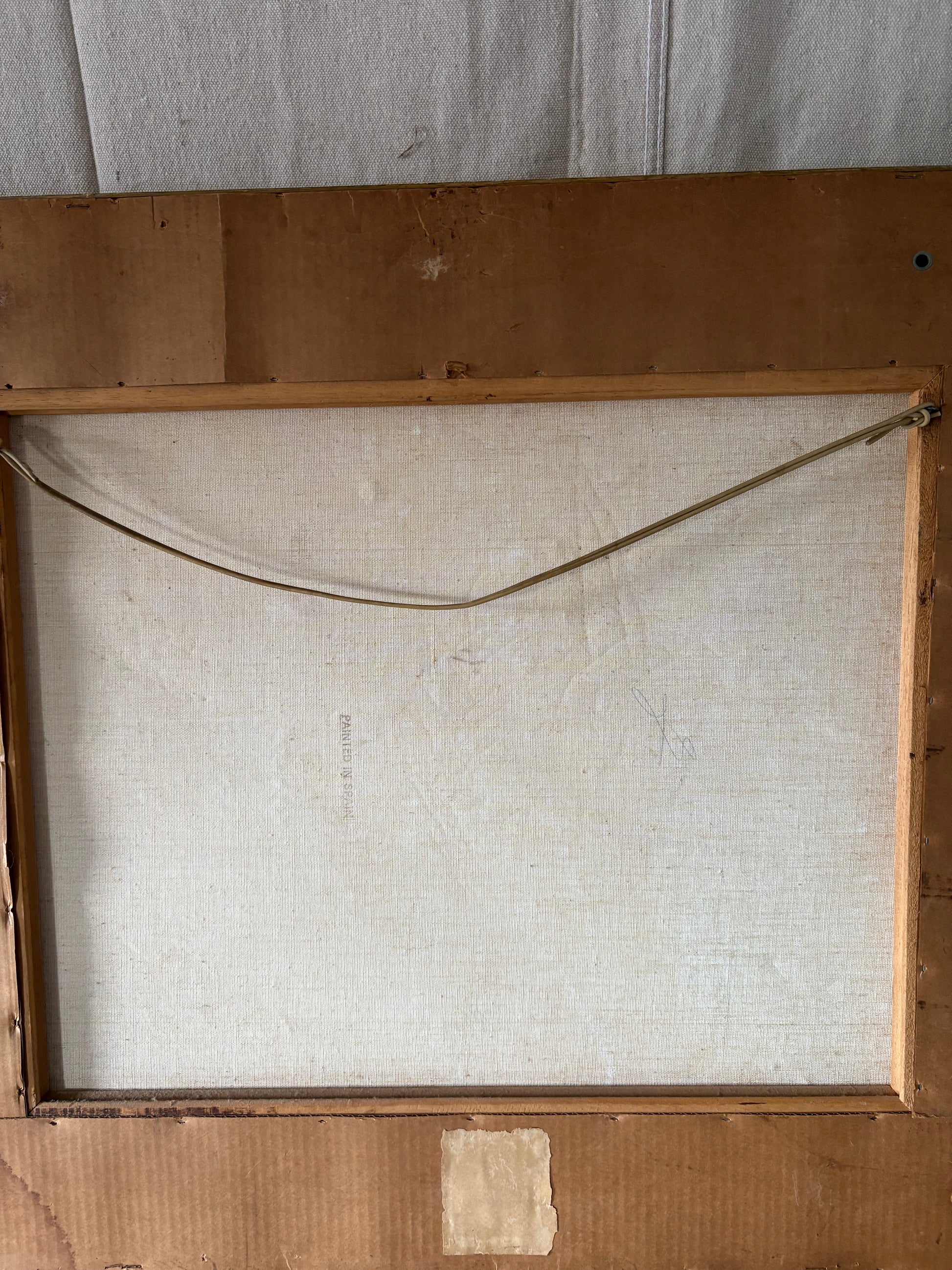 A colorful midcentury oil on canvas landscape painted in Spain. Set in semi-ornate gold painted frame. Hangs by cord.