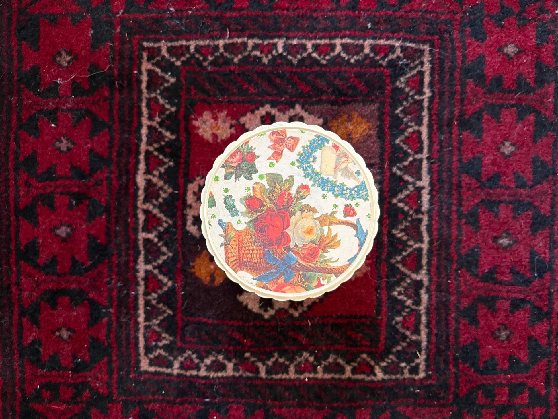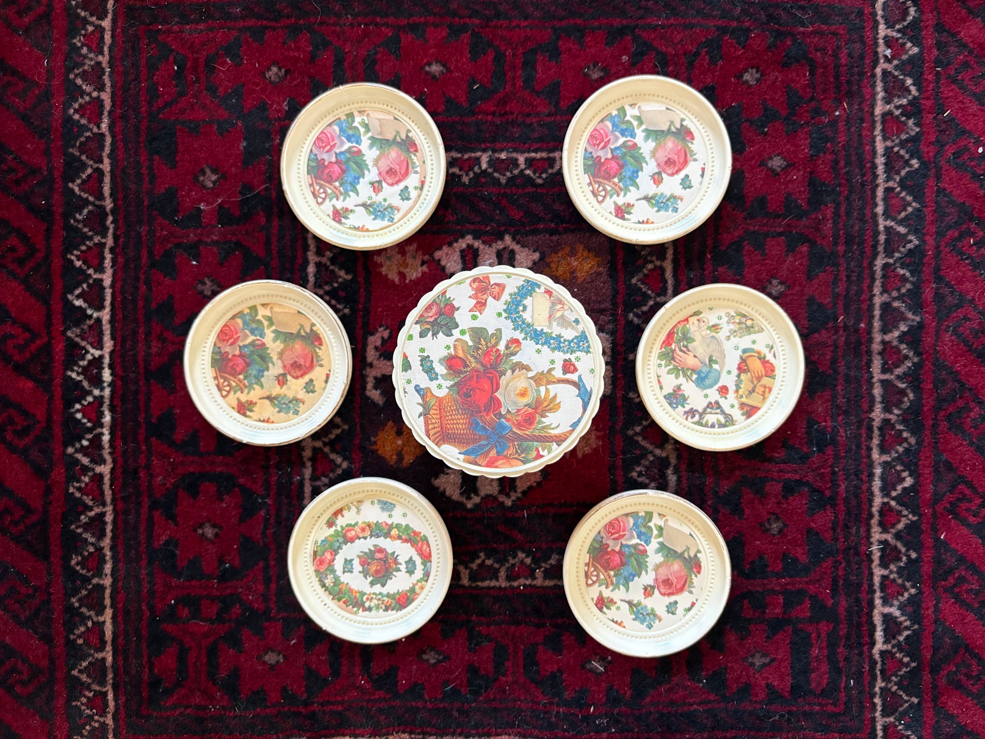 A set of six made-in-Italy plastic coasters with floral motifs and matching box. Some wear around edges. Stamped “Made in Italy” on base. Sourced in Florence, Italy.