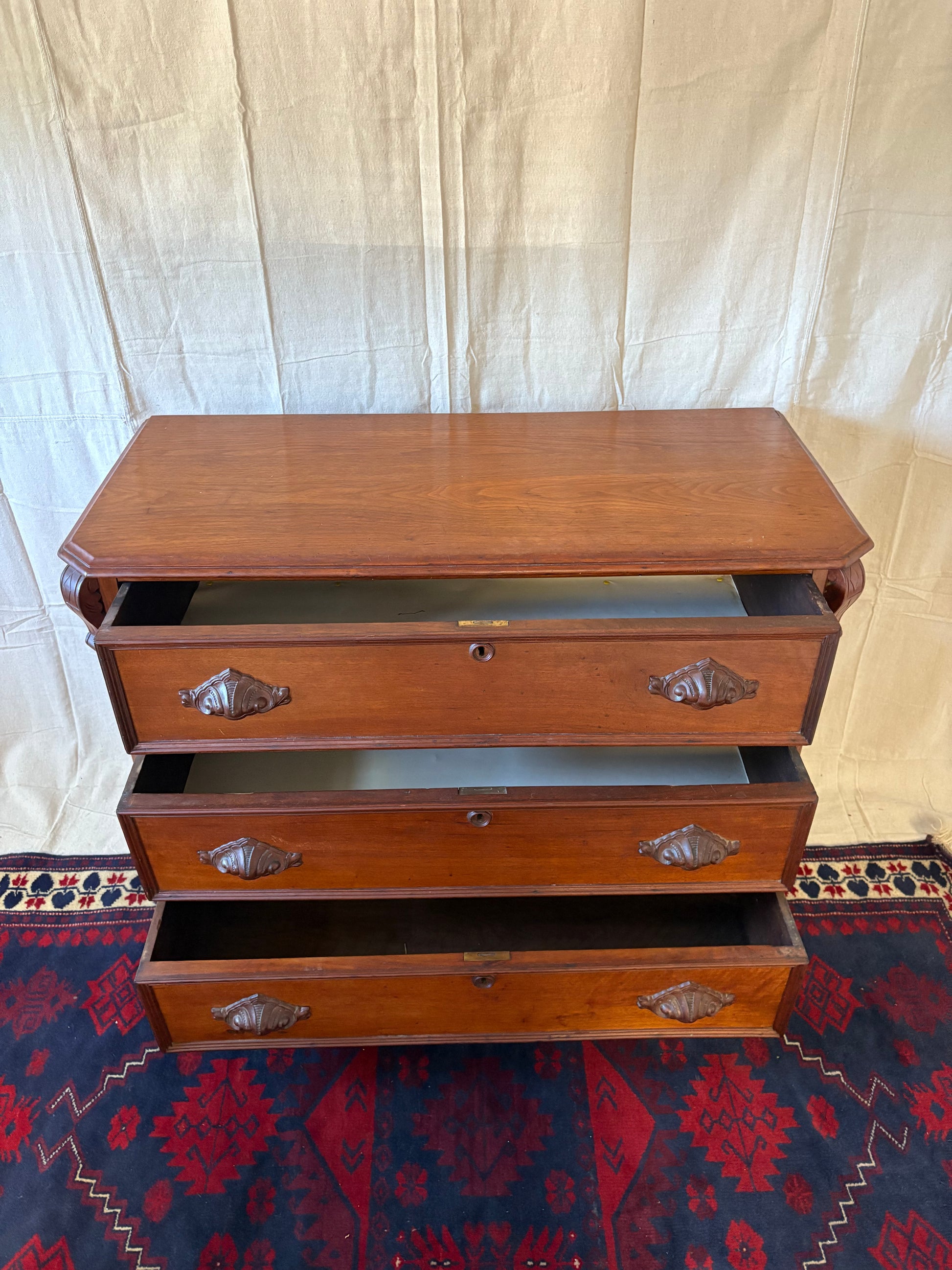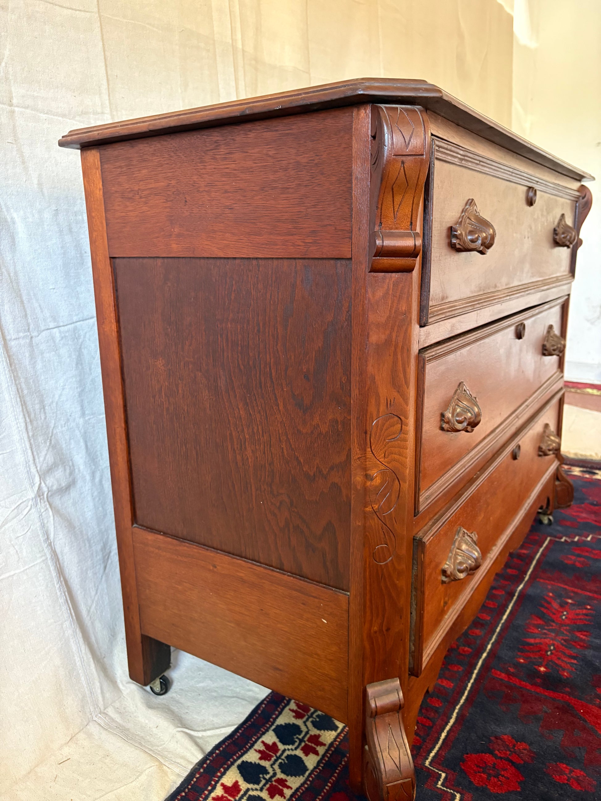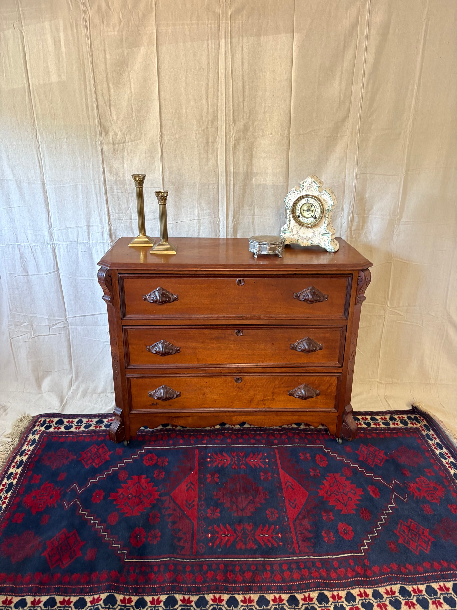 A beautiful Victorian Eastlake-style walnut dresser with three drawers. Each drawer opens by a pair of intricately carved wooden pulls. Simple engravings and accent pieces adorn each post. A contoured stretcher runs across the base. This piece sits atop smooth sliding castors. Some wear to finish commensurate with age and use.